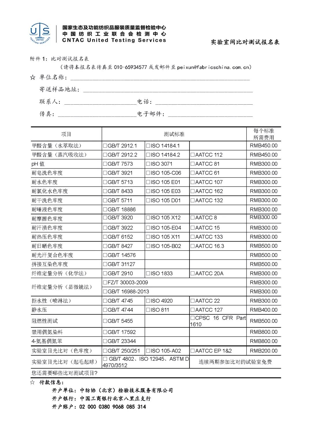 本次比對(duì)測(cè)試于2020年7月15日起開(kāi)始報(bào)名至2020年9月30日?qǐng)?bào)名截止。中國(guó)紡織工業(yè)聯(lián)合會(huì)檢測(cè)中心將為您提供專業(yè)的結(jié)果分析報(bào)告并頒發(fā)結(jié)果證書(shū)。