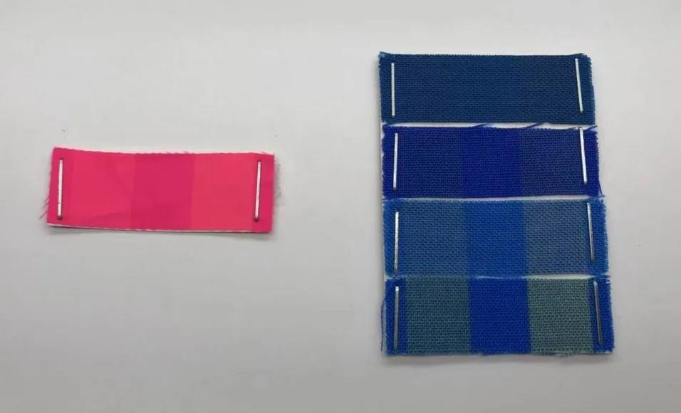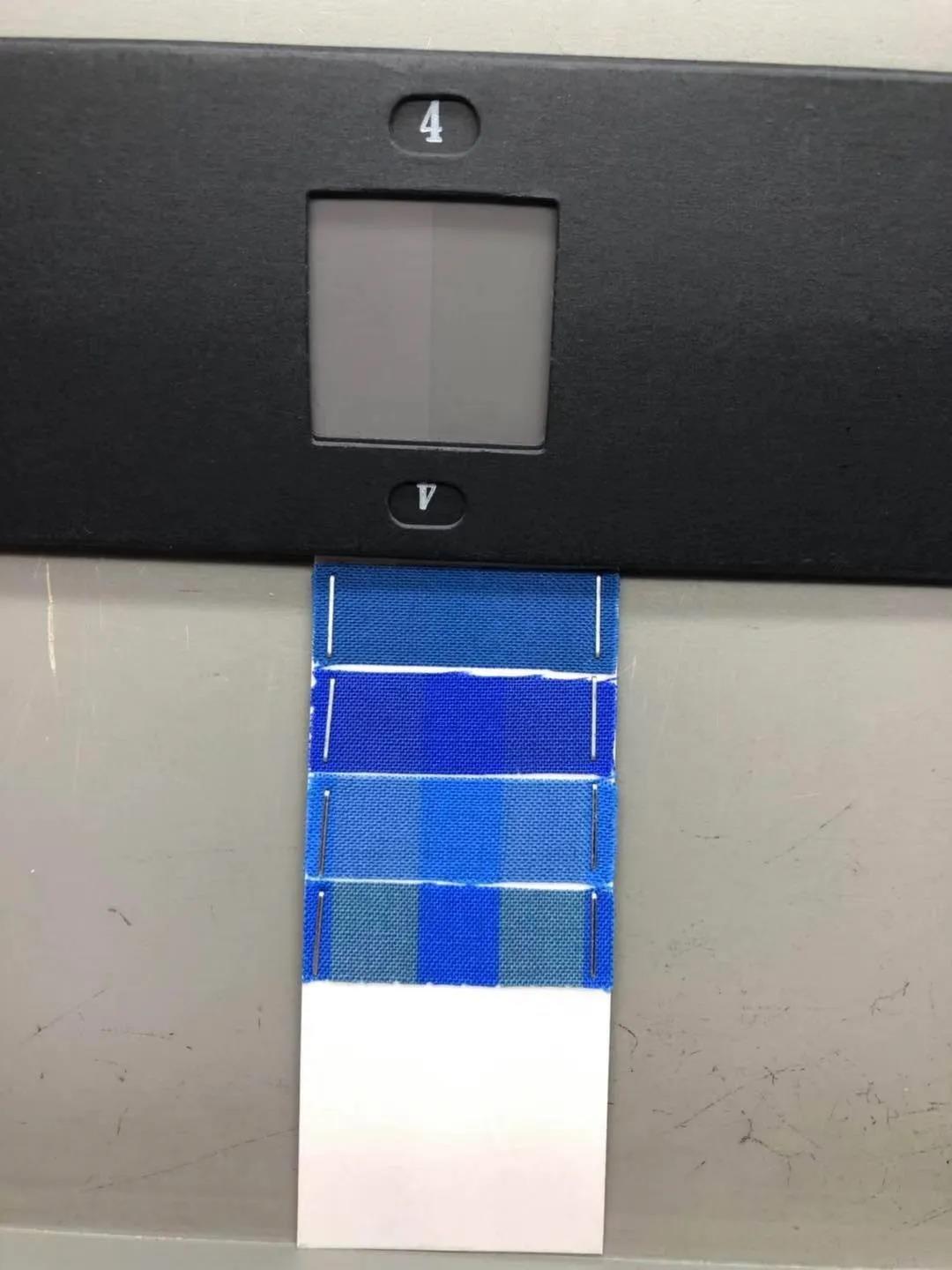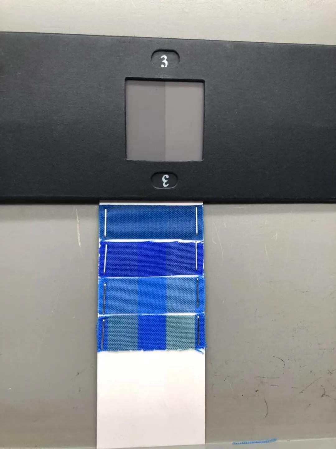 將曝曬過后樣品與藍(lán)色羊毛標(biāo)樣進(jìn)行色差比對(duì),各階段分別對(duì)應(yīng),進(jìn)行級(jí)數(shù)評(píng)定。